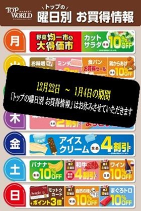 12月22日~1月4日の期間 「トップの曜日別 お買得情報」 はお休みします