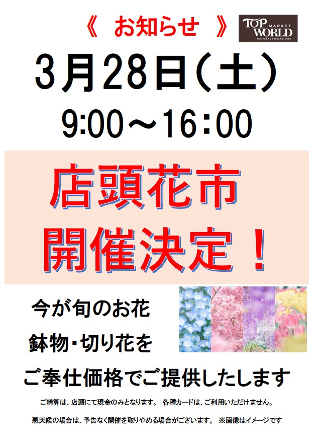 トップワールド香里ヶ丘店にて3月28日(土) 9:00~16:00