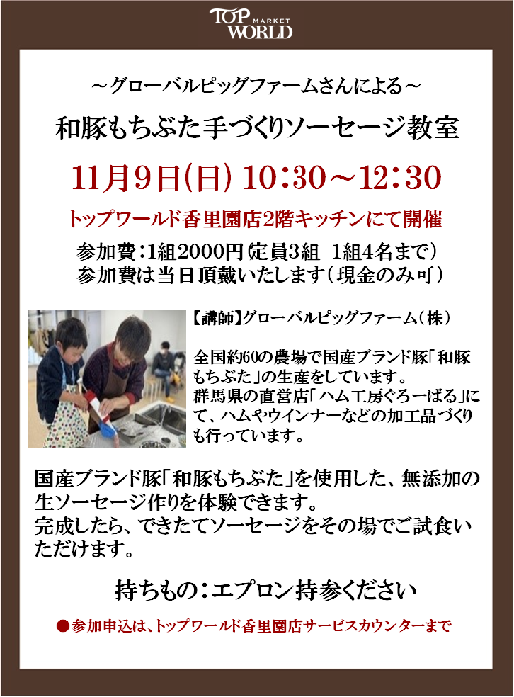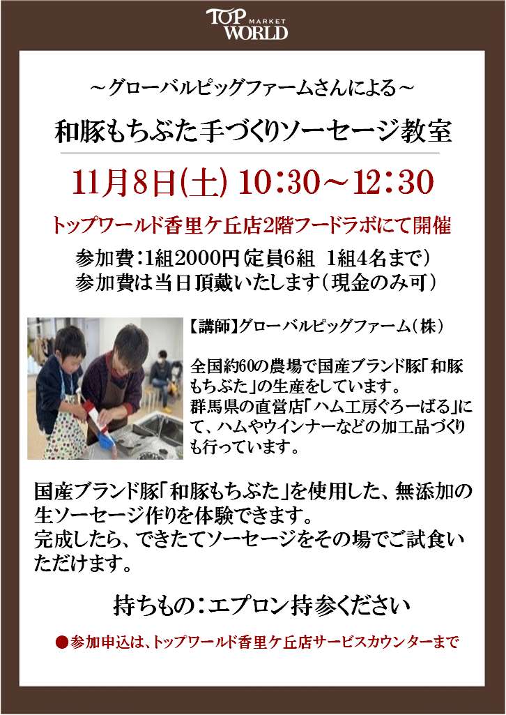 - 香里ケ丘:11月8日(土)・香里園店:11月9日(日)和豚もち豚手づくりソーセージ教室開催します