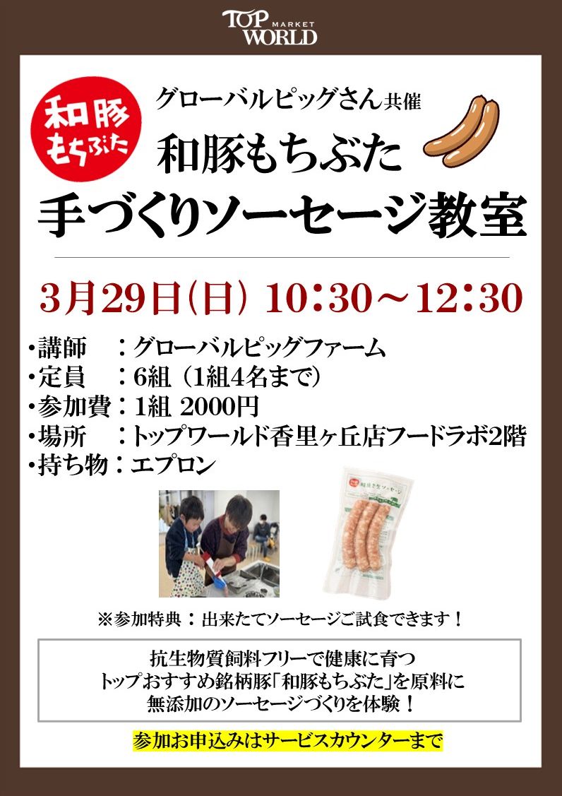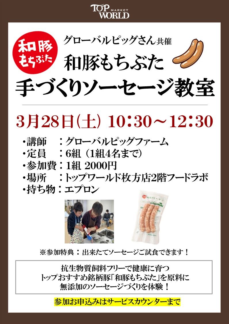 - 枚方店:3月28日(土)・香里ヶ丘店:3月29日(日)和豚もち豚手作りソーセージ教室開催します